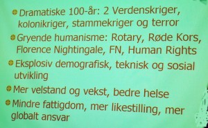 • Globalt perspektiv: I det siste århundre har menneskeheten blitt bedre på å samarbeide. Mest lokalt, men gryende også mer globalt. Eksplosiv befolkningsvekst med mange i 1. generasjon.